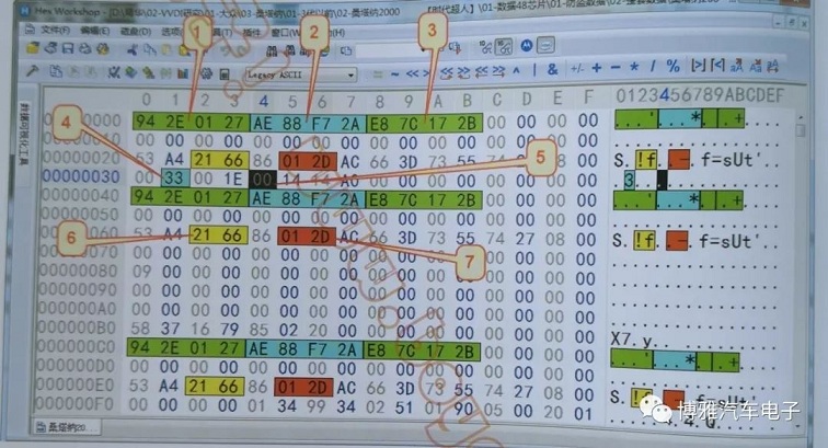 标记5为防盗系统锁死信息,例如输入密码错误次数过多,无芯片钥匙点火次数过多,此位置数据会累加,会引起防盗系统 锁死,故障现象:输入密码后设备提示通讯失败,如发生以上 情况,只要将此位置数据改成00即可接触防盗系统锁死。