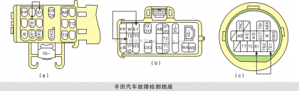 丰田车系的三种型式的自诊断插座的外形图,图(a)和图(b)一般设置在发动室内,图(c)则通常设置在驾驶室内仪表板下方。