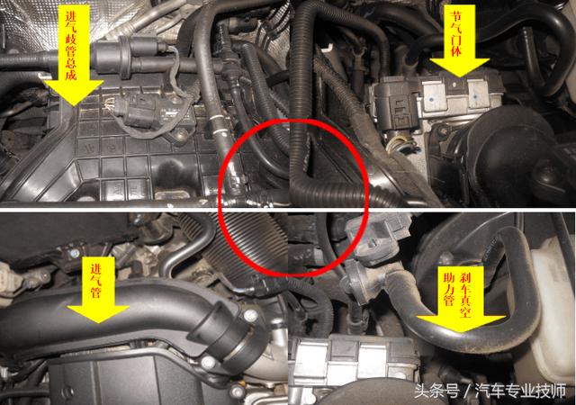 5、根据故障码和故障现象结合数据块检查发动机进气系统,更换了进气支管,节气门,碳管电磁阀,进气管,拆下喷油嘴检查密封垫没有发现异常,堵住刹车助力泵真空管读取发动机节气门电位计数据依然为0.00%,没有变化。