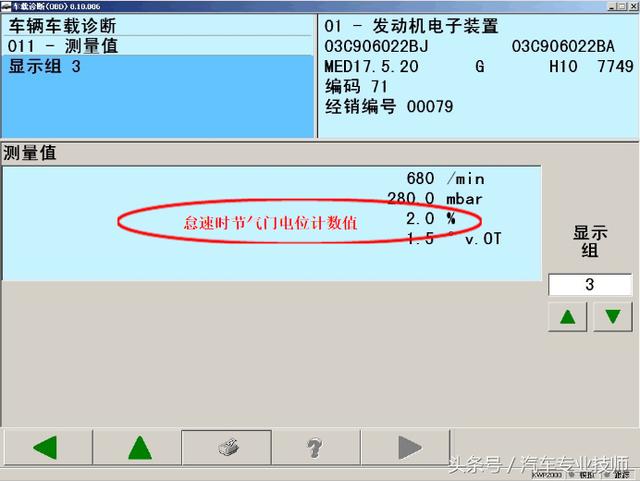 3、读取发动机3组3区节气门电位计数值0.0%不正常,找相同车型读取数据比较在2.0%左右。