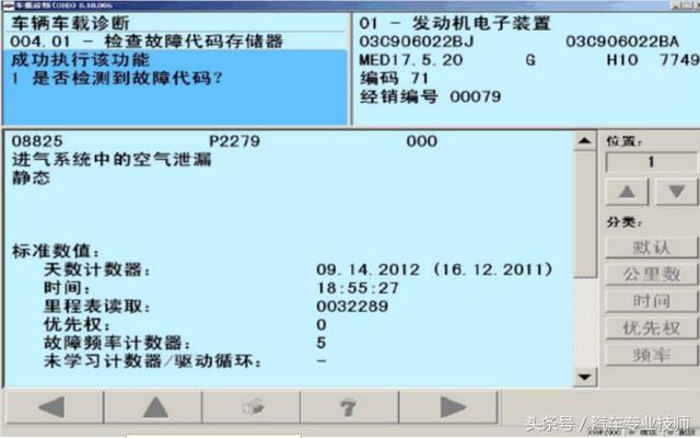 诊断过程: 1、使用VAS5052A检查发动机系统有故障码:08825-发动机进气系统中的空气泄漏。