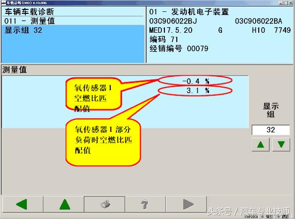 4、进入01发动机系统读取怠速时数据块32组:1、2区数值在正常范围内 。