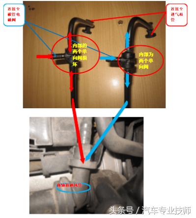 故障处理:更换碳管电磁阀进气管 故障原因分析:由于碳管电磁阀单向阀损坏导致空气没有经过节气门体直接进入进气管导致节气门 电位计在怠速时开度小,发动机在长期高速运转时混合气过稀,发动机根据氧传感器信号在短期可以 对喷油量进行调节,当长期超出可调节范围时尾气排放故障灯报警 专用工具/设备:诊断仪VAS5052A |