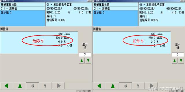 2、进入01发动机系统读取怠速时数据块2组2、3区喷油脉宽和进气压力数值和正常车辆相比较有一定偏差,喷油脉宽正常在0.77ms,4组水温、进气温度数值正常。