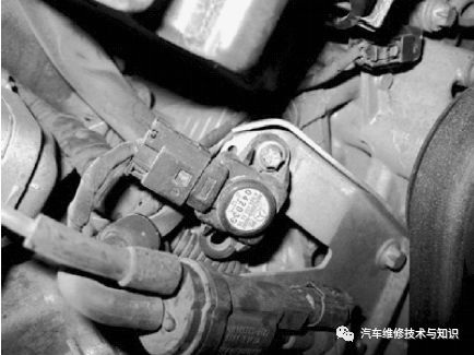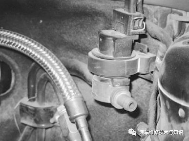 连接真空表 首先松开排气管接口处螺栓,此时排气管噪声立即变大,但进气压力参数未呈现明显变化,发动机仍然严重抖动,因此排除了排气管堵塞可能。接下来,对进气管及各真空管进行了泄漏测试。利用化油器清洗剂对各接口处及进气系统接口垫进行喷洒试验,未发现发动机转速有明显变化。为进一步确定进气系统是否泄漏,用软布堵住进气口,发动机瞬时熄火。 以上2种方法虽然不是很严谨,但可以排除局部严重漏气的可能。 之后,对该车发动机进行了燃油系统压力、喷油器雾化及流量测试,未发现任何异常。拆下火花塞观察火花塞的燃烧情况时发现,火花塞电极处比正常燃烧要黑,通过内窥镜进一步观察气缸内及气门颈部的积炭发现,该车发动机的积炭很少。测量气缸压力及点火正时也均符合要求。根据喷油脉宽的显示值及拆检火花塞的结果,可以确定该车发动机混合气偏浓,但查看空气流量传感器显示值为12kg/h(标准值为12~20kg/h),符合标准。由于发动机喷油脉宽主要取决于转速信号和空气流量传感器信号,修正量取决于冷却液温度及氧传感器等信号,所有基本信号及修正信号都在标准范围内(3.0~3.2ms),多出的1ms喷油脉宽是从何而来的呢? 根据维修经验,一般燃油蒸发排放系统和废气再循环系统出现问题会导致混合气异常,且容易被人忽视,为此决定对这两个系统进行检查。断开活性炭罐控制电磁阀((如下图所示),用手堵住进气口,发动机怠速时依旧抖动,发动机控制系统动态数据流各参数无明显变化,表明燃油蒸发排放系统无泄漏现象。