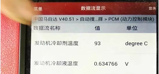 图1 冷却液温度读数 笔者本着先易后难的原则,重点检查电子扇熔丝和插接器,均正常,供电线路无断路、短路现场,搭铁端也无电压降。检查冷却系统管路和散热器,无松动、泄漏和脏污。检查散热器上、下水管温度差,此时温度已十分接近,说明节温器已经打开,发动机冷却系统大循环工作良好。 由于电子扇一直没有起动,于是笔者用工具敲击电子扇轴心外壳,此时电子扇开始转动,再观察冷却液温度也随之下降。但几分钟后,电子风扇发出摩擦声,并且产生一股焦糊味,这说明电子扇转轴内部有故障。于是拆下电子扇分解检查,发现电子扇定子与转子轴承内部有烧蚀卡滞现象,供电线焊点也有烧蚀脱焊问题。 至此,故障点找到了,正是由于电子扇故障导致水温过高,同时也导致空调冷凝器散热不良,使高压管路产生过压,密封圈失效后制冷剂漏失,最终造成空调不制冷。 故障排除 更换电子扇,修复空调管路漏点并加注制冷剂,起动发动机试车,随着冷却液温度上升,电子扇能够正常变速,冷却液温度随之恢复到正常值93℃(图2),路试中开启空调,制冷良好,确认故障彻底排除。
