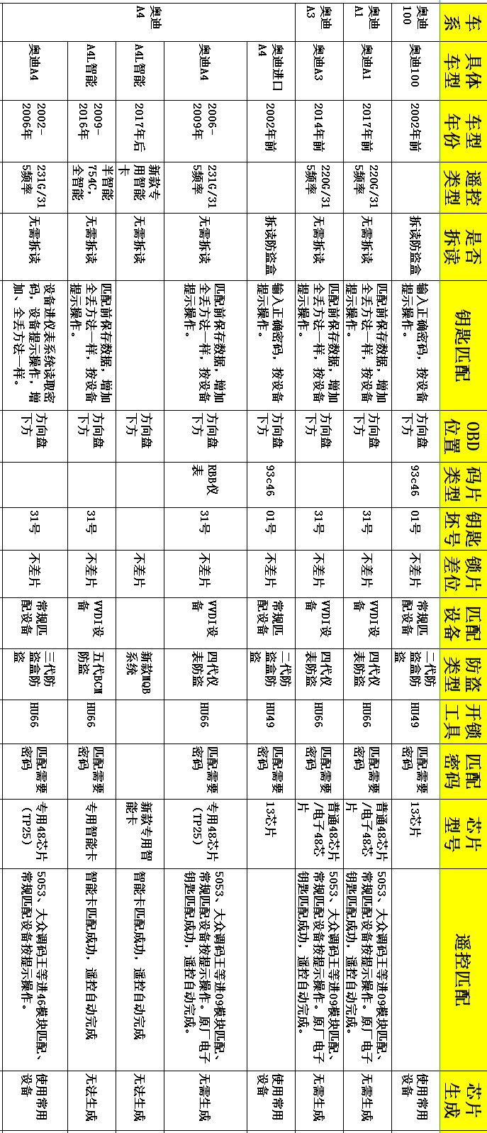 为粉丝宝宝们整理了全套防盗匹配资料,每期发布一个汽车品牌(包含品牌旗下热门车型的防盗匹配项目),本期发布:奥迪。大家可以参照进行操作,如资料有误,请回复消息至作者调整纠错:【横向阅读】