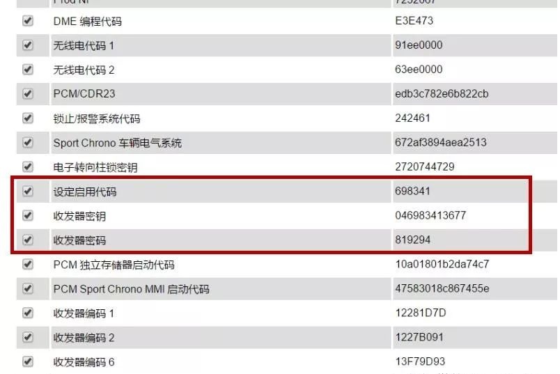 红色方框标记部分,设定启用代码、收发器密钥、收发器密码,这三个就是配钥匙要用到的密码。