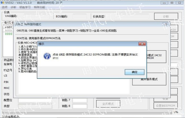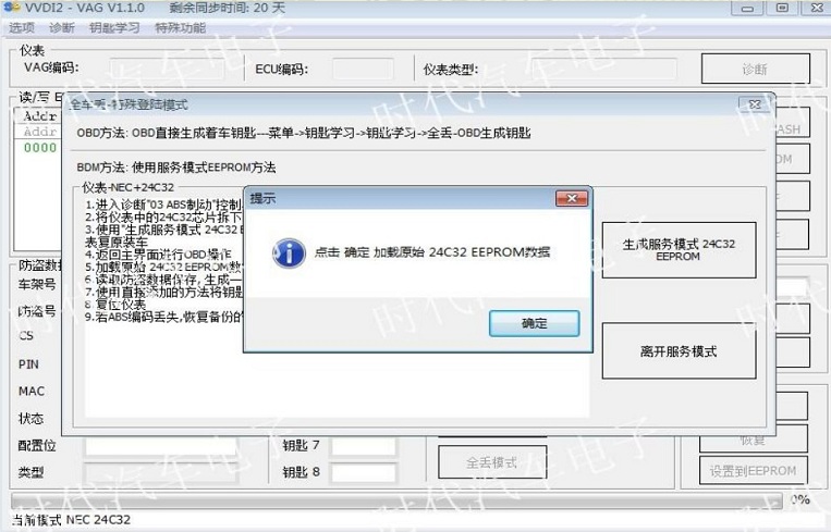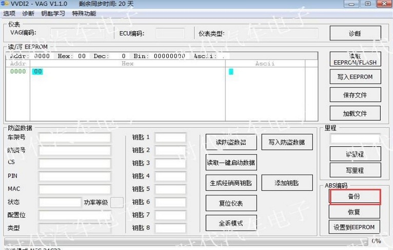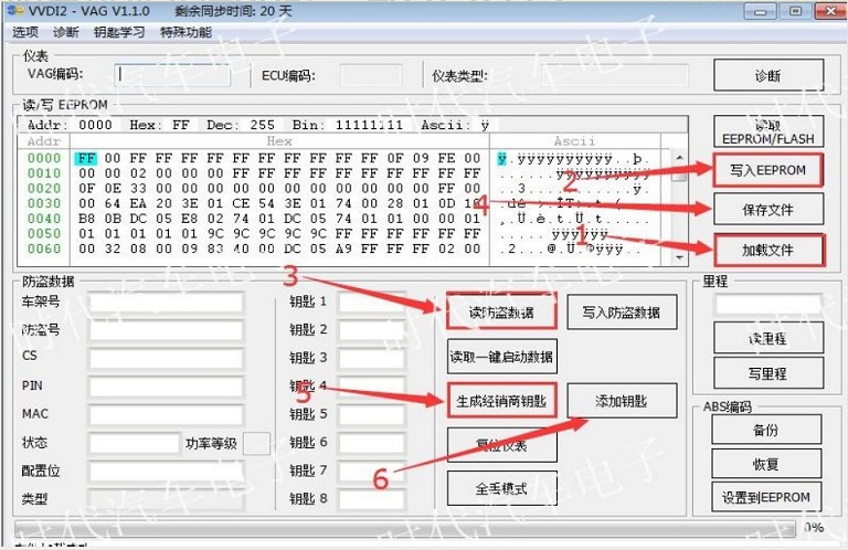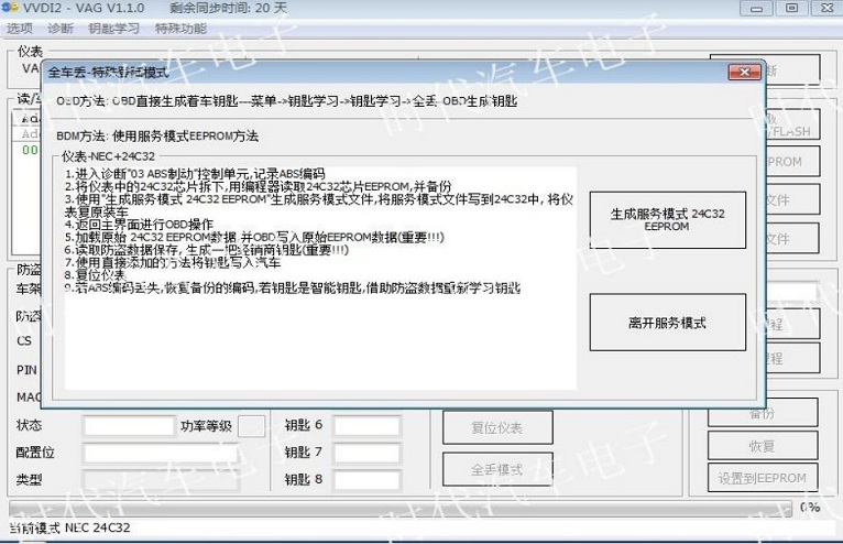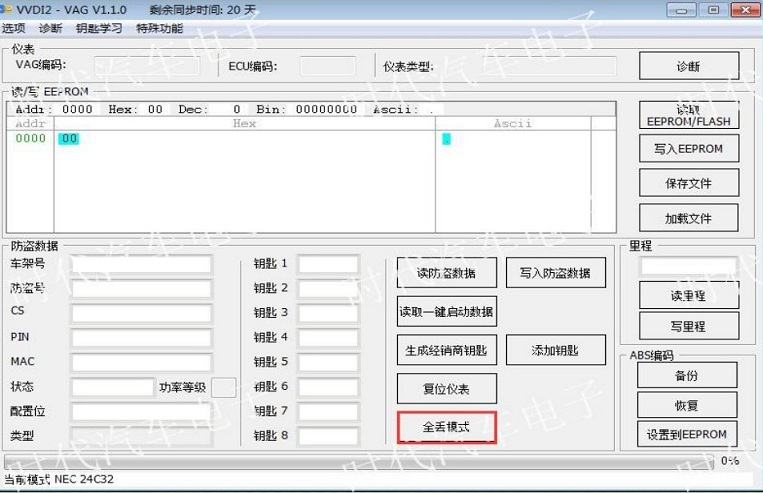 一、拆仪表生成数据做全丢 二、OBD直接做全丢。 拆仪表做全丢方法: ①备份ABS编码 ②读取仪表中的24C32/64数据保存。 ③生成服务模式数据写到仪表中,装车。 ④VVDI加载原始数据写入仪表。 ⑤读取防盗数据,保存。生成经销商钥匙,匹配。 ⑥复位仪表,恢复ABS编码。