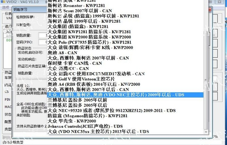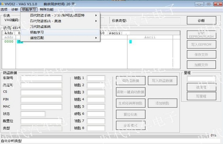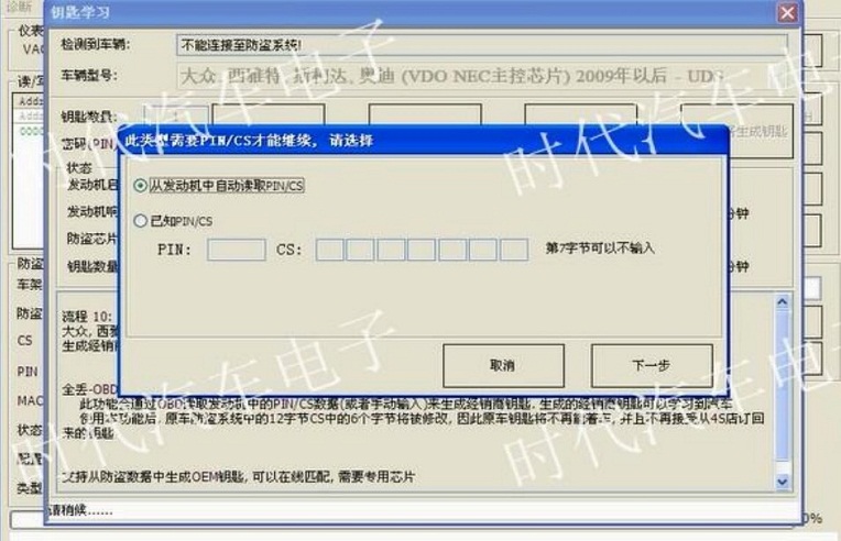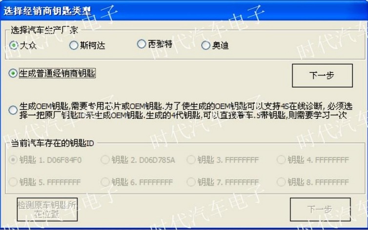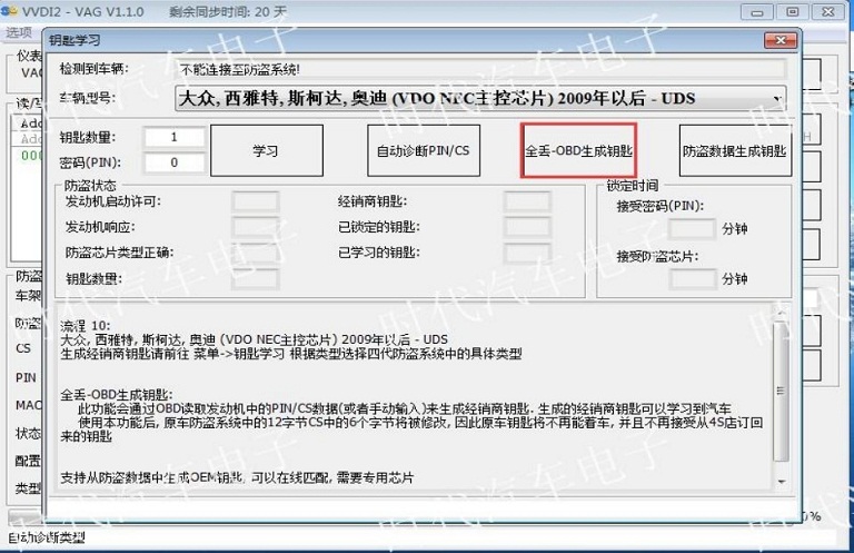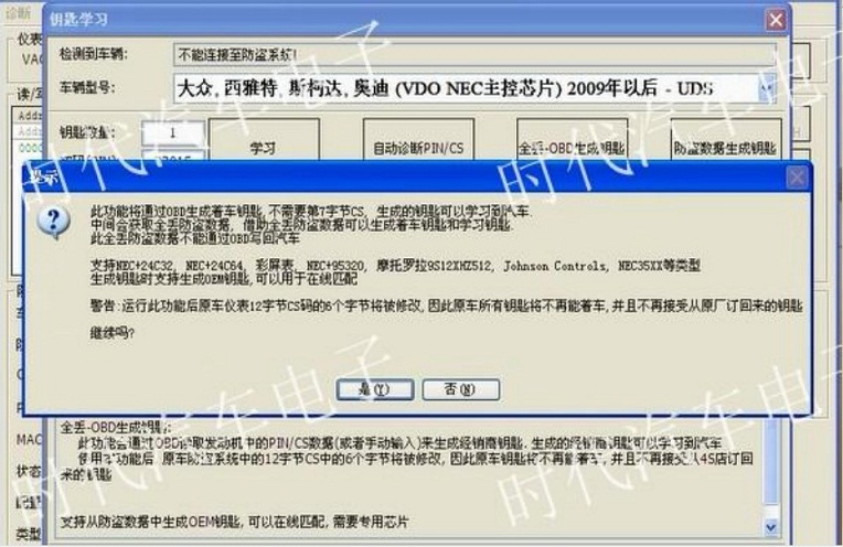 二、全丢-OBD生成钥匙: 此功能会通过OBD读取发动机中的PIN/CS数据(或者手动输入)来生成经销商钥匙. 生成的经销商钥匙可以学习到汽车 使用本功能后, 原车防盗系统中的12字节CS中的6个字节将被修改, 因此原车钥匙将不再能着车,并且不再接受从4S店订回来的钥匙。